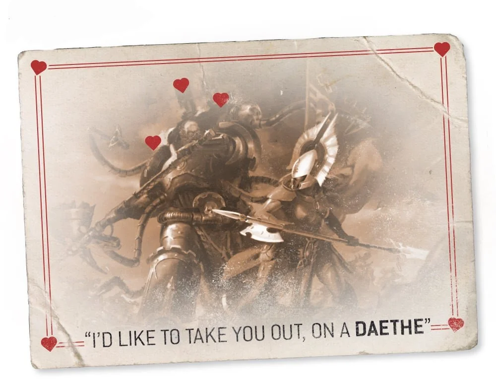 But where Heart Day truly thrives is in the Astra Militarum. In a galaxy where your average life expectancy is measured in minutes, love is just another word for unit cohesion. Forget lace and perfume. A Guardsman’s Heart Day card is usually a piece of recycled Munitorum parchment. The sentiment is a grim reminder that the person to your left is the only thing between you and a hungry Genestealer. The message? “I’d jump on a frag-grenade for you, as long as the Emperor watches.”