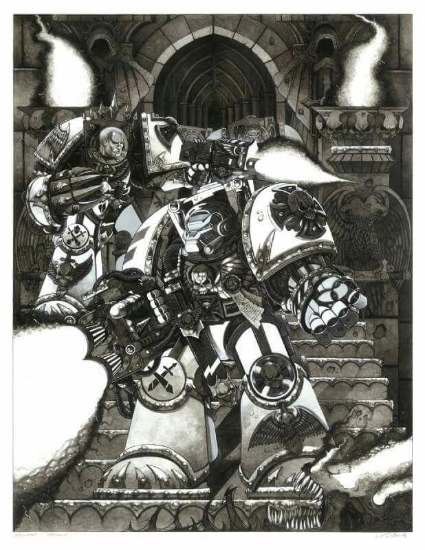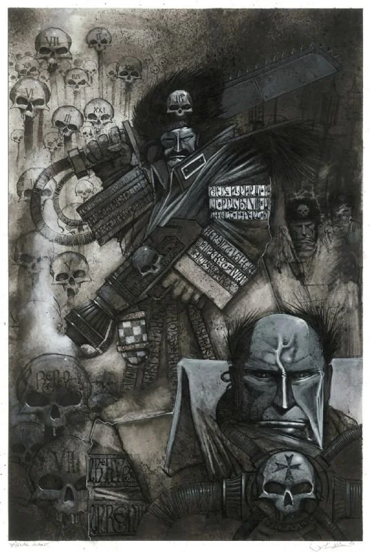 His work was that of a medieval 2000AD cover by way of a dark ages metal band. Layers of detailing that rewarded the eye for taking the time to explore and often an impractical amount of skulls. His work for both GW and in Magic The Gathering is signature art in it's own right whether it was beautifully colour or starkly desaturated with jagged steel, spikes, more skulls and sinister embellishments (often skulls) created characters to imagine tales and games about. Everything had a sense of heavy weight of years about it, and his 40k creations were undoubtedly some of the best examples of the neo-gothic styles of the Imperium with some truly weird Tyranid designs) that polished 2nd Ed up no end.